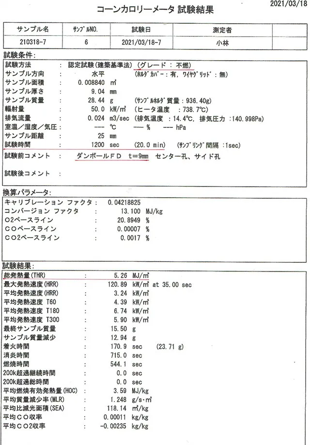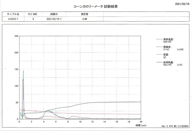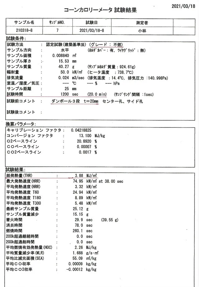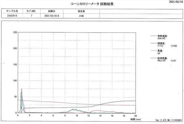2021年3月18日 発熱性燃焼試験(コーンカロリーメーター法)で20分後次の値を出しました。